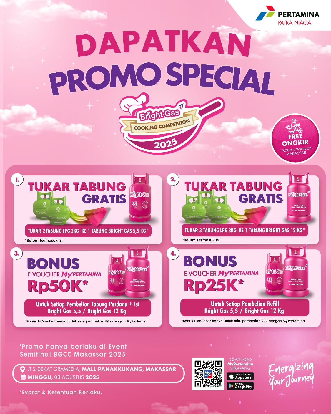 Semarak acara di Makassar akan semakin lengkap dengan berbagai kegiatan menarik yang sayang untuk dilewatkan. Pengunjung dapat menyaksikan langsung keseruan para finalis Sulawesi Selatan yang akan berkompetisi mengolah hidangan khas Nusantara dalam panggung semifinal BGCC. Selain itu, Pertamina juga menghadirkan berbagai penawaran spesial seperti promo tukar tambah tabung gas—cukup menukar 2 tabung LPG 3 kg untuk mendapatkan 1 tabung Bright Gas 5,5 kg, atau 3 tabung LPG 3 kg untuk ditukar dengan 1 tabung Bright Gas 12 kg.