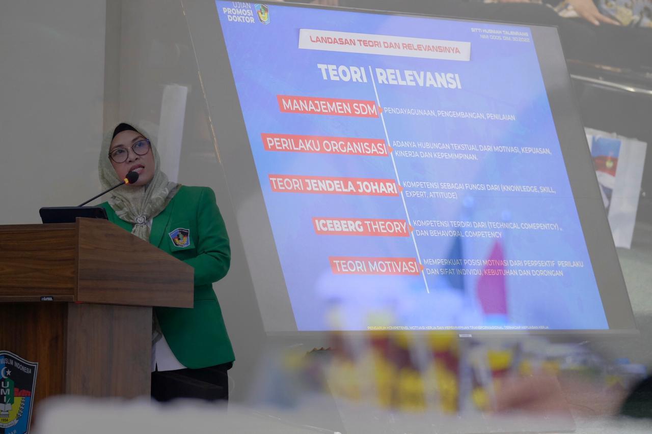 Dalam ujian promosi ini, Husniah Talenrang mengangkat judul disertasi “Pengaruh Kompetensi, Motivasi Kerja dan Kepemimpinan Transformasional Terhadap Kepuasan Kerja dan Kinerja Pegawai Negeri Sipil (PNS) pada Pemerintah Kabupaten Gowa”.