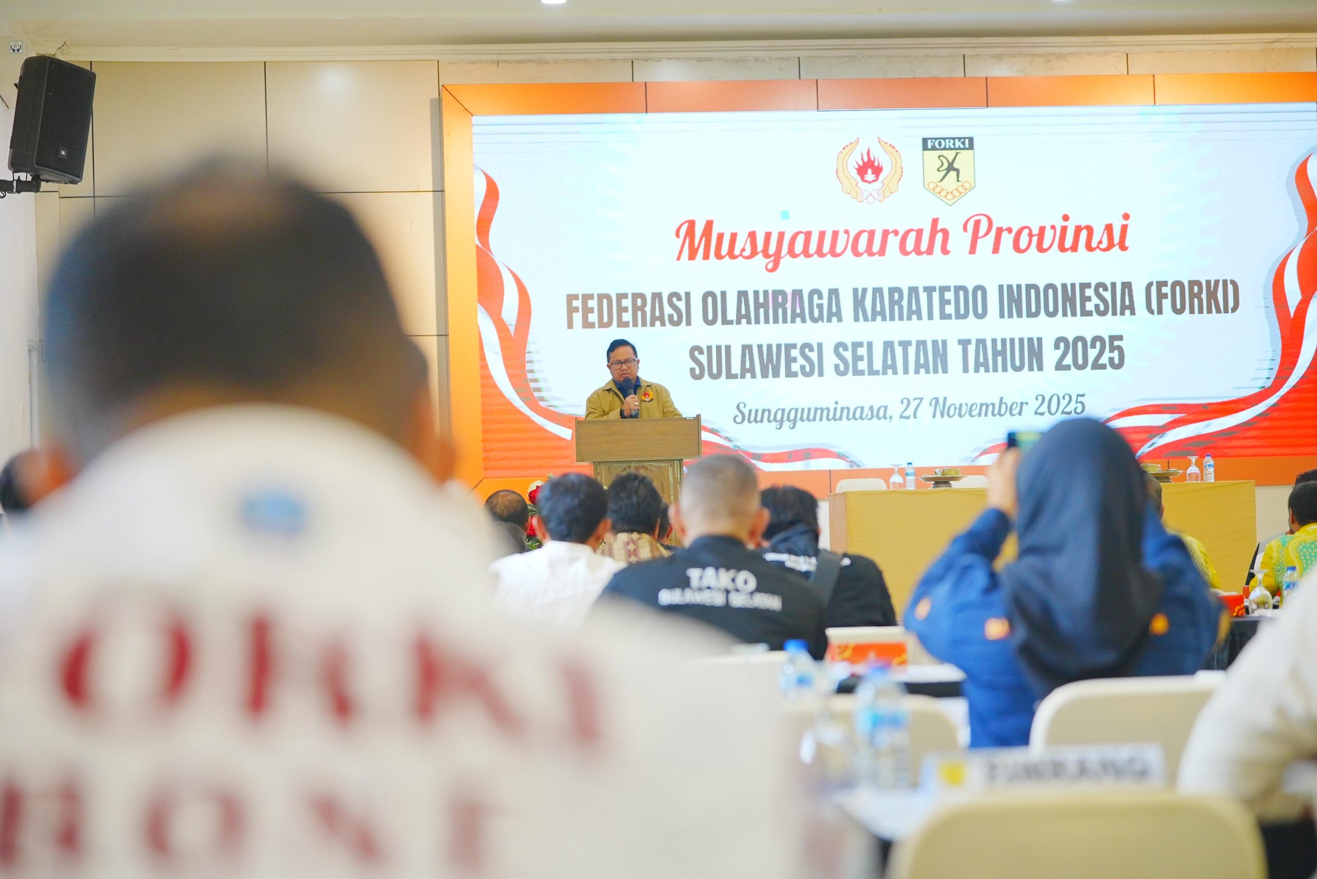 GOWA – Ketua Komite Olahraga Nasional Indonesia (KONI) Sulawesi Selatan, Darmawangsyah Muin resmi membuka Musyawarah Provinsi (Musprov) Federasi Olahraga Karate-Do Indonesia (FORKI) Sulawesi Selatan di Aula Cemara, Palantikang, Kabupaten Gowa pada Kamis, 27 Nopember 2025.